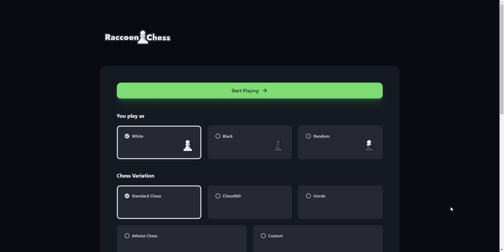 Raccoon Chess is a website where you can play chess is a website where you can play chess against your friends across the globe without needing an account! Just share the link and your playing.